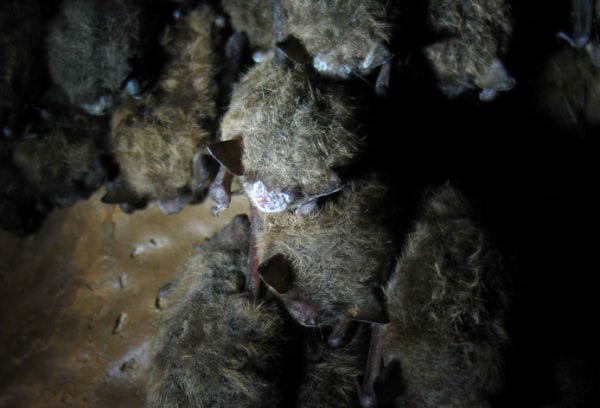 A cluster of little brown bats hanging in the Greises Cave in Allegany County, Maryland, in 2010. The center bat has White-Nose Syndrome. (Daniel Feller/ Maryland Department of Natural Resources)
