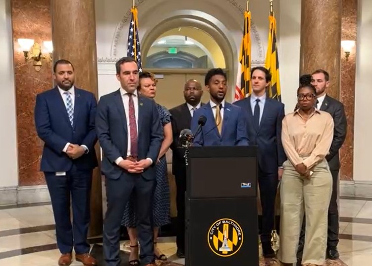 Mayor Brandon Scott speaks during a press conference May 12, 2025 about a package of bills being introduced to allow for more multi-family housing. Screenshot via livestream by Charm TV Baltimore.