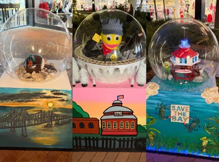 (Left to right) Snow globes created by students from Boys’ Latin School of Maryland, Calvert School, and The Bryn Mawr School are among those displayed at The Village of Cross Keys.