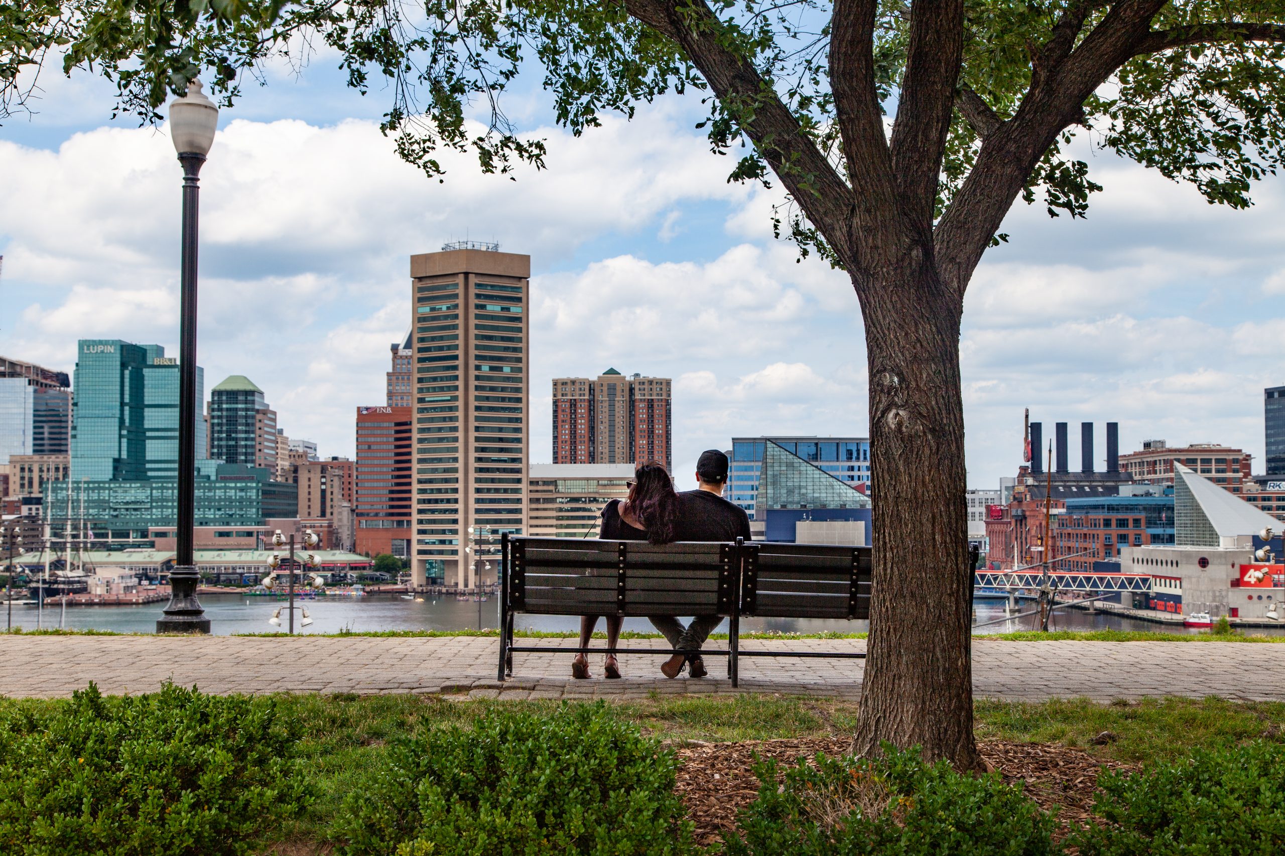 Two people sit on a bench in Baltimore’s Federal Hill Park. Photo by Barrett Doherty courtesy The Cultural Landscape Foundation.