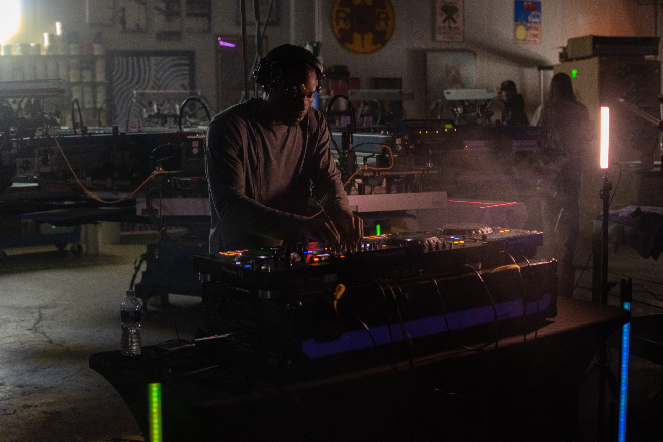 Washington D.C. DJ Soso Tharpa performs in front of a printing press at a Beatitude DIY rave at Syndicate Screenprinting Company in November 2024. Photo by Maria Eberhart.