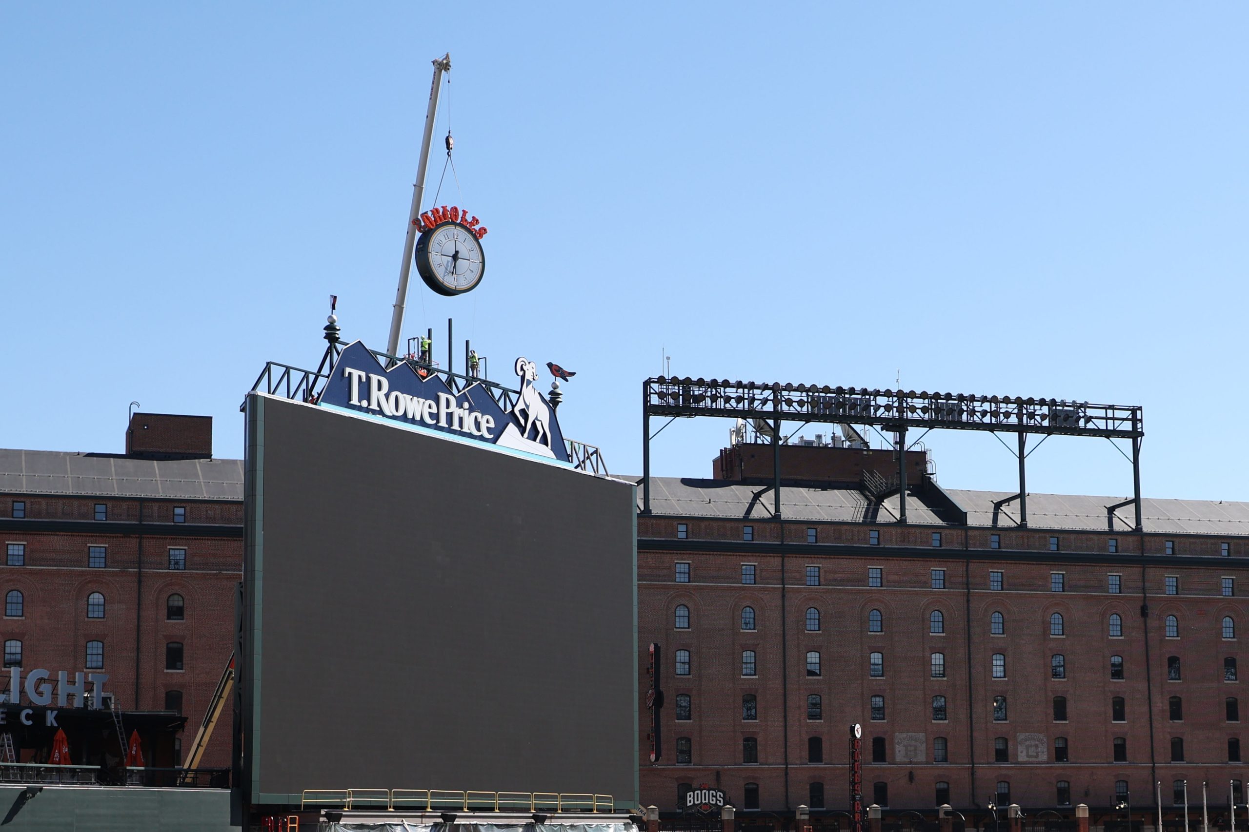 A clock hangs over the billboard at Oriole Park at Camden Yards. Photo courtesy Baltimore Orioles.