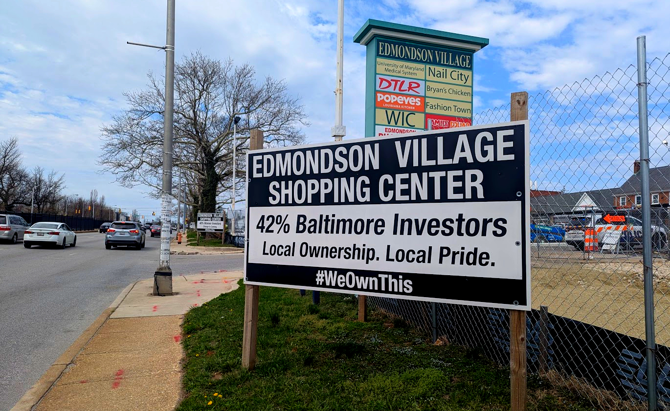 Motorists on Route 40 on the west side of Baltimore see signs telling of local investment in the redevelopment of Edmondson Village Shopping Center.