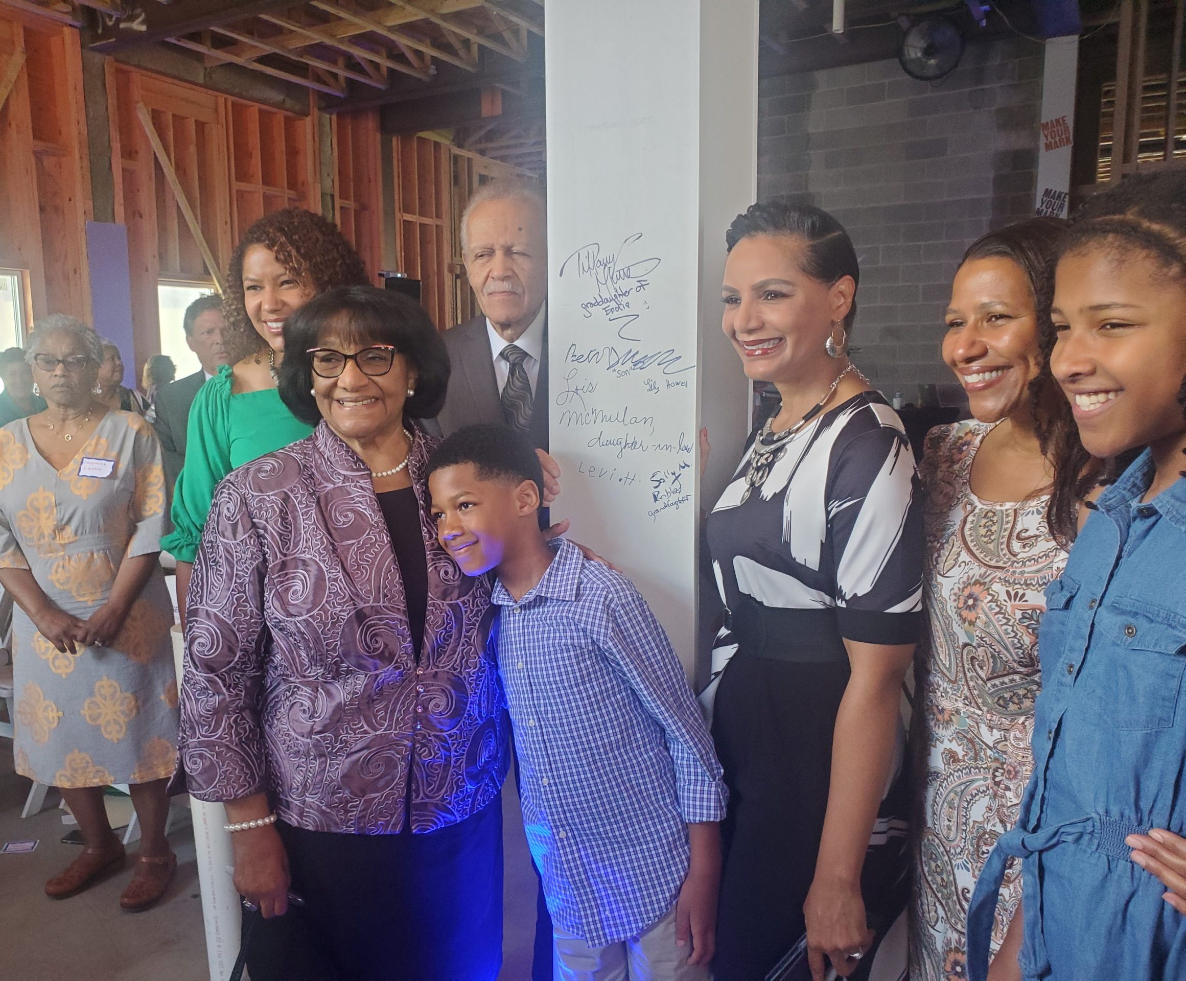 Members of the McMillan family sign a column in the building that will bear Enolia Pettigen McMillan’s name. Photo by Ed Gunts.