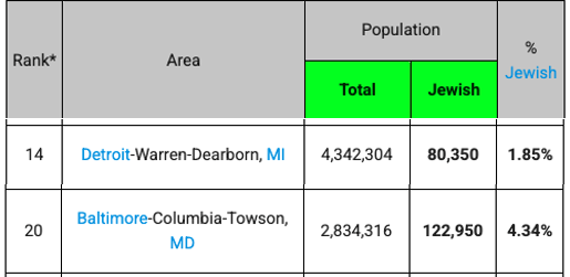 Graphic via Jewish Virtual Library, “Largest Jewish Populated Metropolitan Areas in the United States 2024”, numbers based on U.S. Census data.