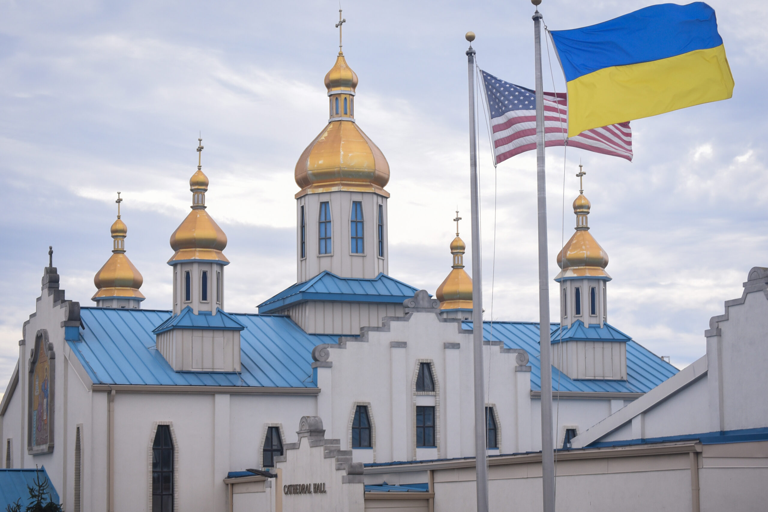 American and Ukrainian flags fly above the St. Andrew Cathedral in Silver Spring, Md. (Robert Stewart/Capital News Service)