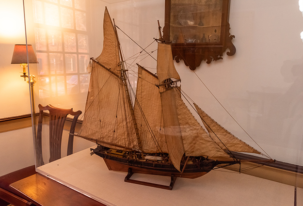 A model of a topsail schooner. Robert Long was a merchant, and his cargo would have been carried on these stypes of ships. These schooners had a shallow draft, large rectangular main sail, and raked mast that made them fast and manuverable. At the Robert Long house during Doors Open Baltimore on Oct 25 2025 in Baltimore, MD. (credit: Carl Schmidt/Federal Hill Photography, LLC)