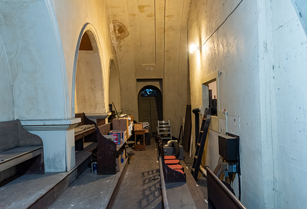 A view of pews in the upper story, behind the organ, now closed off by the wall to the right. Carriage staff would sit here during a service. At First Unitarian Church of Baltimore during Doors Open Baltimore on Oct 25 2025 in Baltimore, MD. (credit: Carl Schmidt/Federal Hill Photography, LLC)