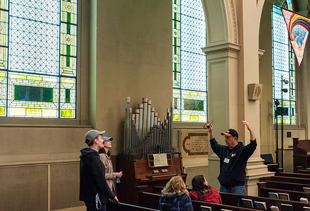 Mike Cross-Barnet (right, orange cap) provides a guided tour of the church. At First Unitarian Church of Baltimore during Doors Open Baltimore on Oct 25 2025 in Baltimore, MD. (credit: Carl Schmidt/Federal Hill Photography, LLC)