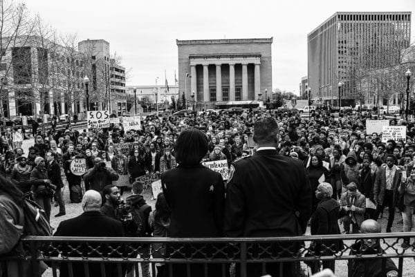 Mayor Catherine Pugh and Baltimore Police Commissioner Darryl De Sousa address hundreds of students at the walkout.