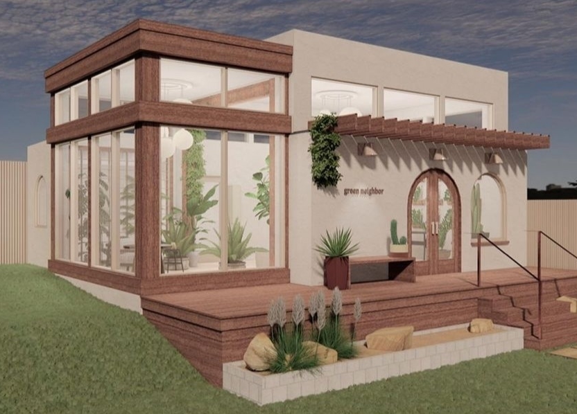 A rendering shows the planned renovations for the Green Neighbor plant shop, a new venture by plant stylist and author Hilton Carter and Good Neighbor café owner Shawn Chopra. Rendering by SM+P.