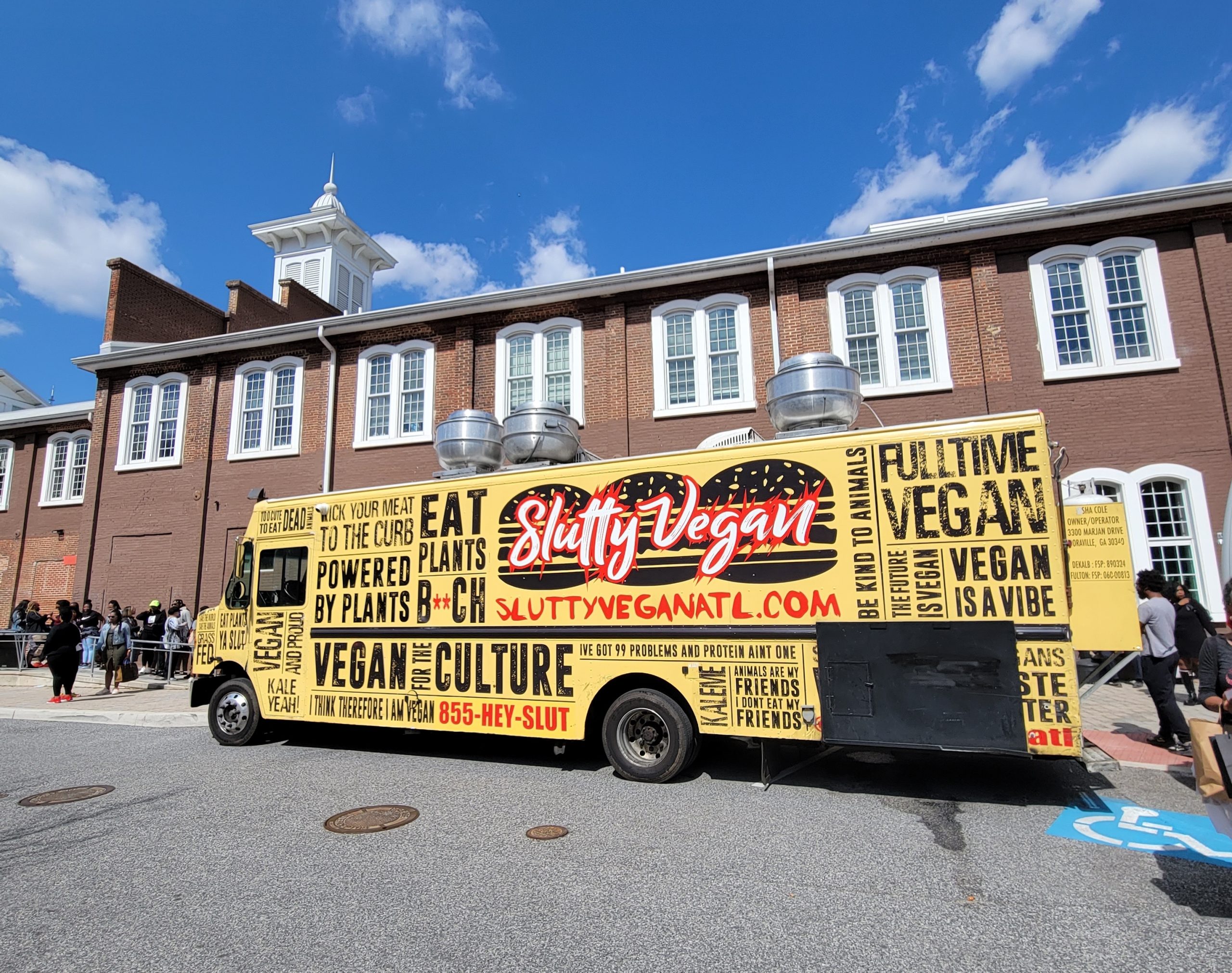 Atlanta-based burger joint Slutty Vegan, founded by Baltimore native Pinky Cole, held a food truck pop-up event at Whitehall Market on Monday. Staff fed customers out of their affectionately named food truck, the “Big Ol’ Slut.” Photo by Marcus Dieterle.